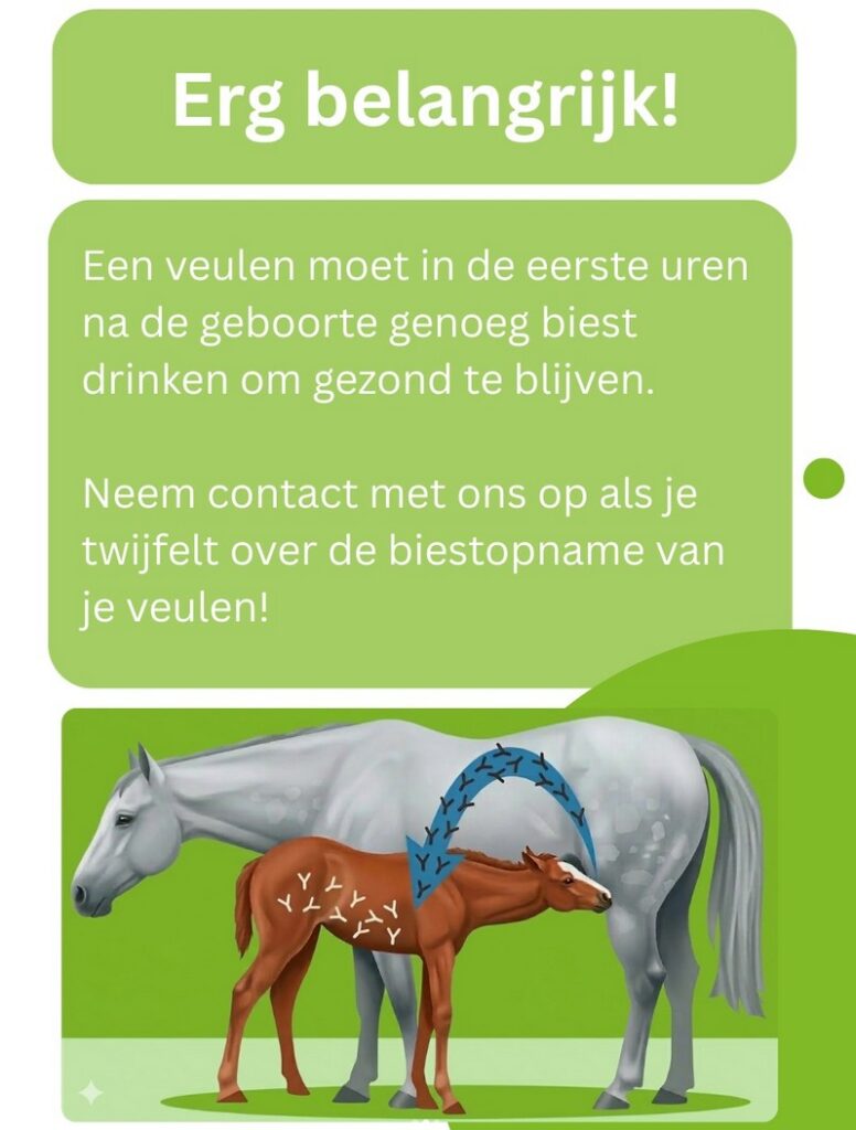 De geboorte van een veulentje is leuk, maar ook heel erg spannend! In de eerste uren na de geboorte is het belangrijk dat het veulen voldoende biest bij de merrie drinkt, omdat het veulen op deze manier antilichamen binnenkrijgt die essentieel zijn voor de afweer. In de eerste 12 uur na de geboorte kunnen de antilichamen door de darm opgenomen worden, hierna neemt deze functie snel af. Soms heeft een veulen in de eerste uren hierbij wat hulp nodig